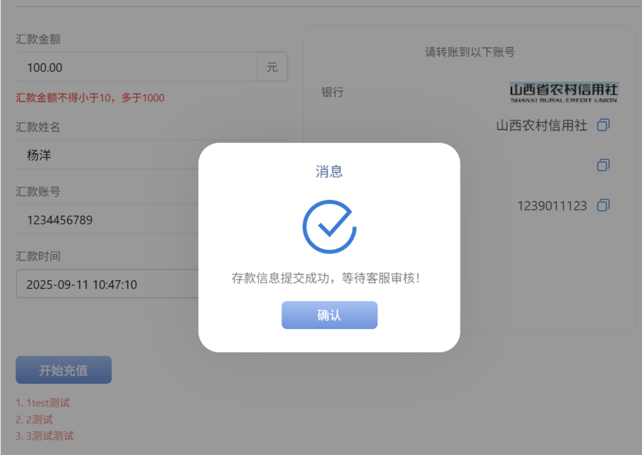 【温馨提示:实际付款金额务必与提交金额一致,请按照流程付款,并请勿保留旧的充值记录私自或重复转账,否则无法到账】